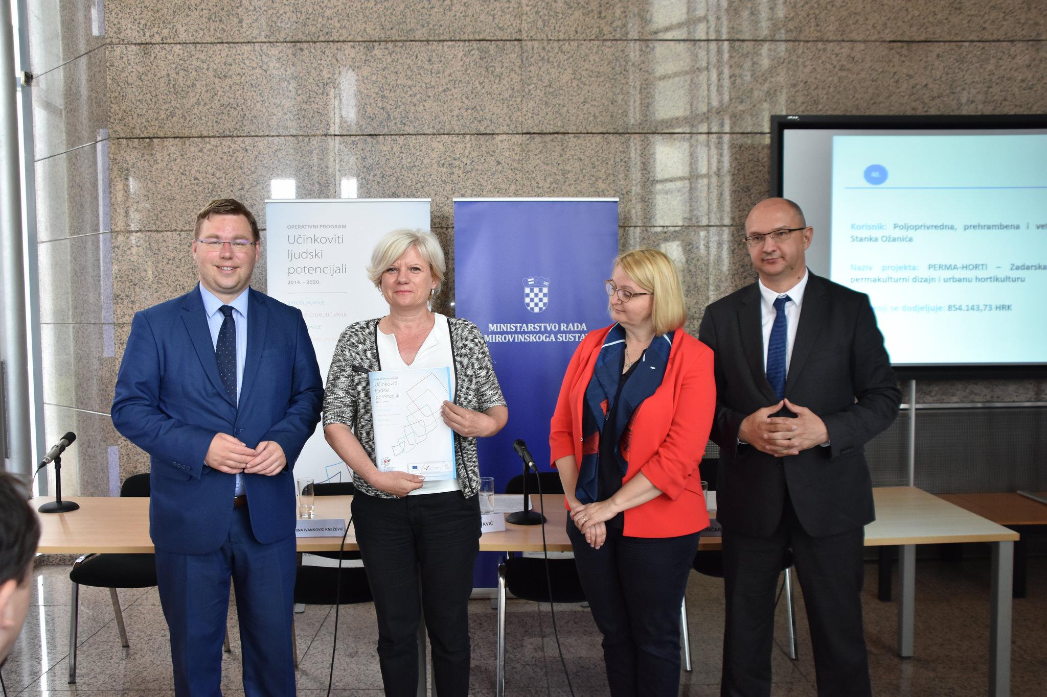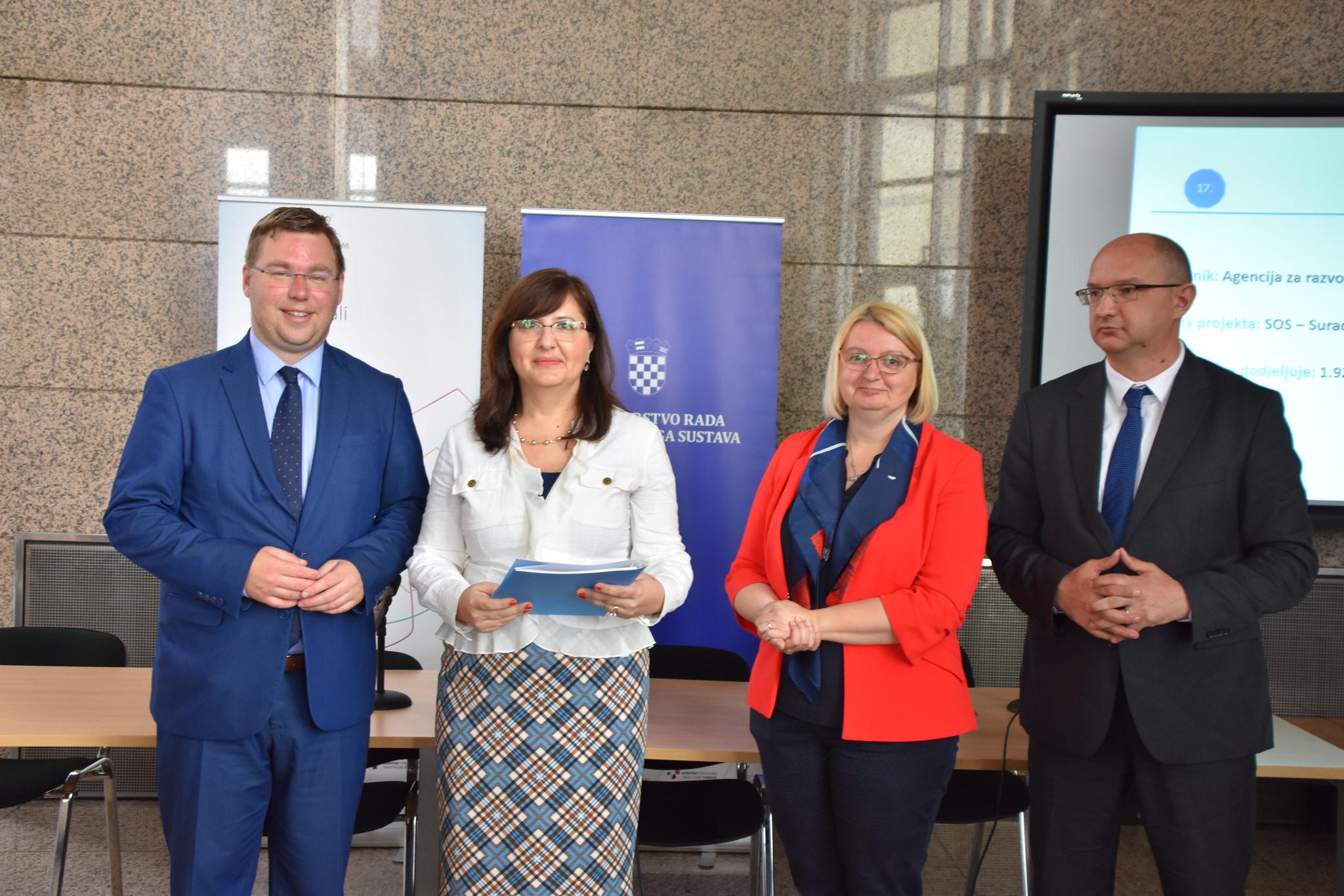 Ministar rada i mirovinskoga sustava mr.sc. Marko Pavić i ravnatelj Hrvatskog zavoda za zapošljavanje Ante Lončar uručili su u ponedjeljak, 14. svibnja u Nacionalnoj i sveučilišnoj knjižnici u Zagrebu ugovore za 55 projekata vrijednih više od 71 milijun kuna. Među projektima odobrenima za financiranje je i projekt „SOS – Surađuj i ostvari sebe“, čiji je prijavitelj Agencija za razvoj Zadarske županije ZADRA NOVA, te je ugovor preuzela ravnateljica ZADRE NOVE Sanja Peričić.
