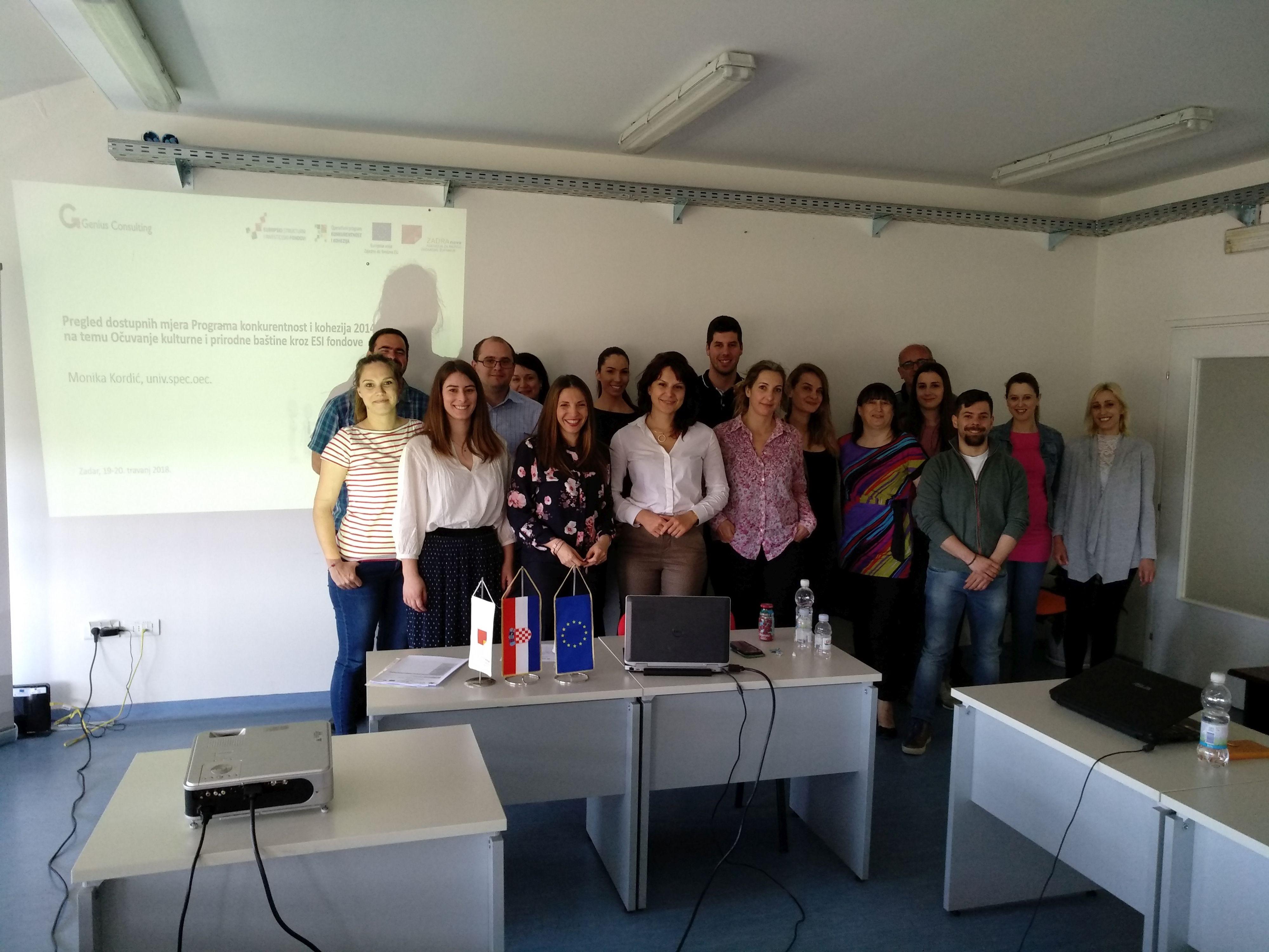 Radionica pod nazivom ”Očuvanje kulturne i prirodne baštine kroz ESI fondove – proces pripreme i financiranja projekata” održana je u Agenciji za razvoj Zadarske županije ZADRI NOVOJ 19. i 20. travnja 2018. godine u sklopu projekta ”Učinkovito upravljanje i korištenje sredstava Europskih strukturnih i investicijskih fondova na području Zadarske županije”.