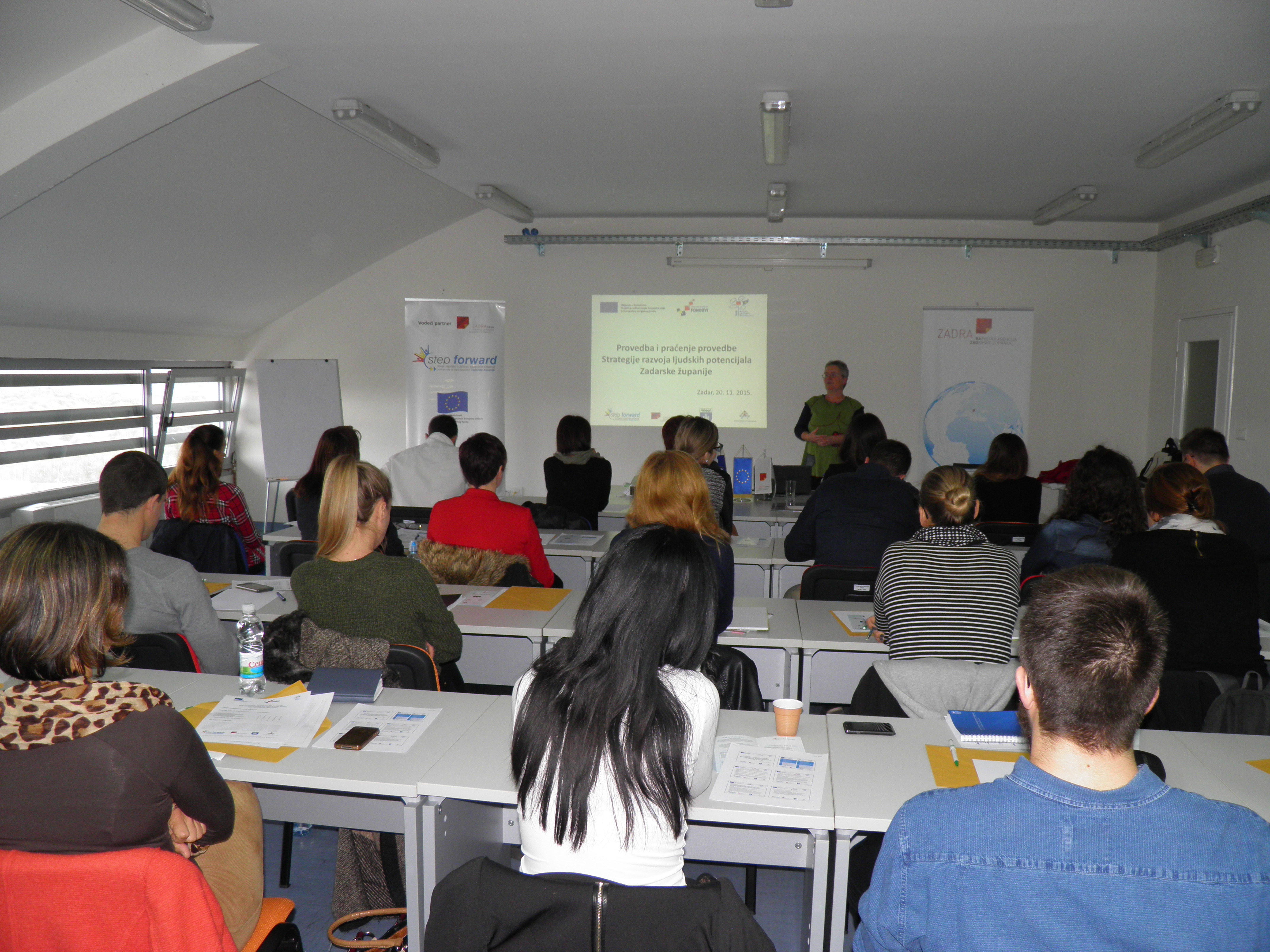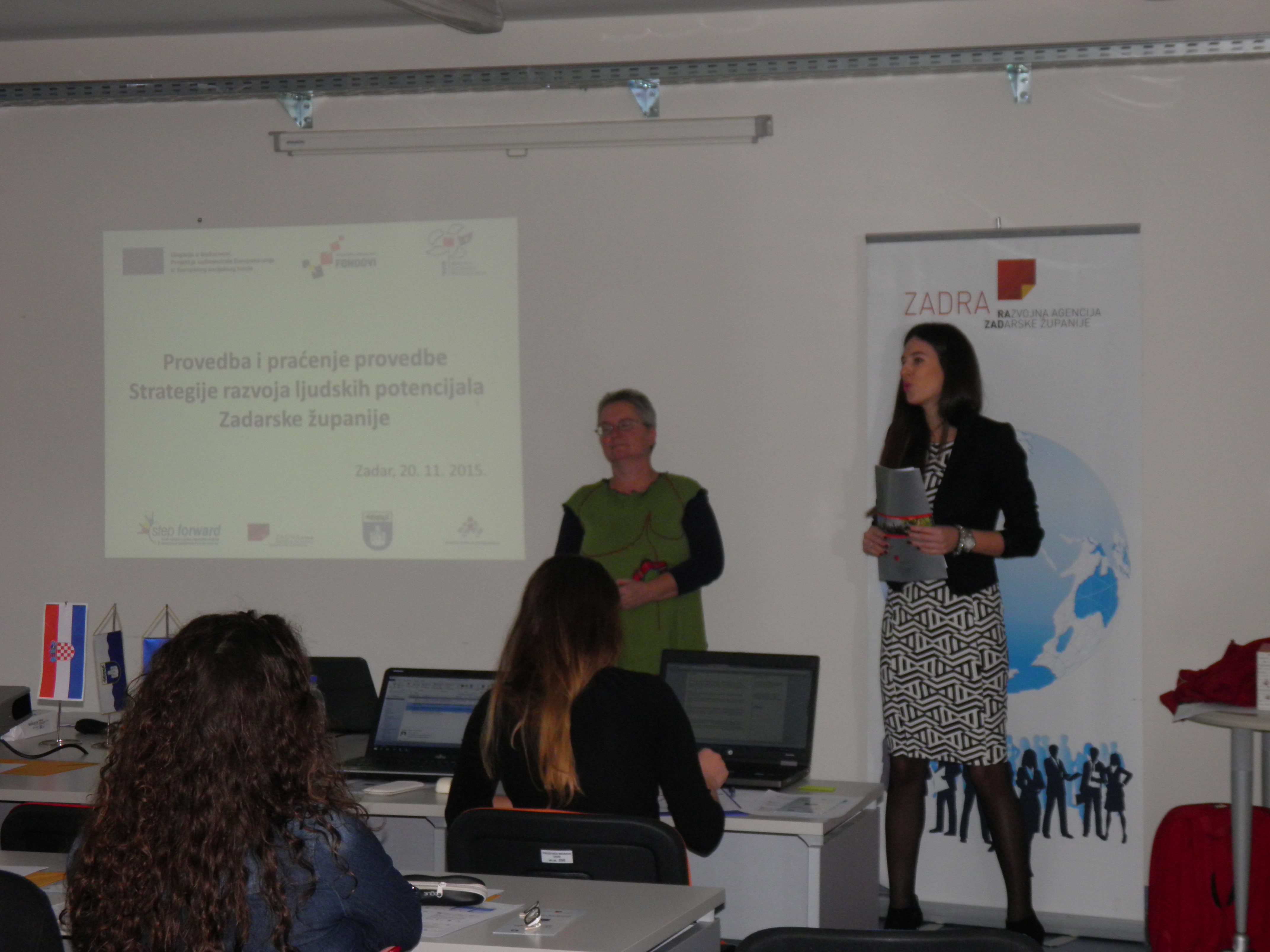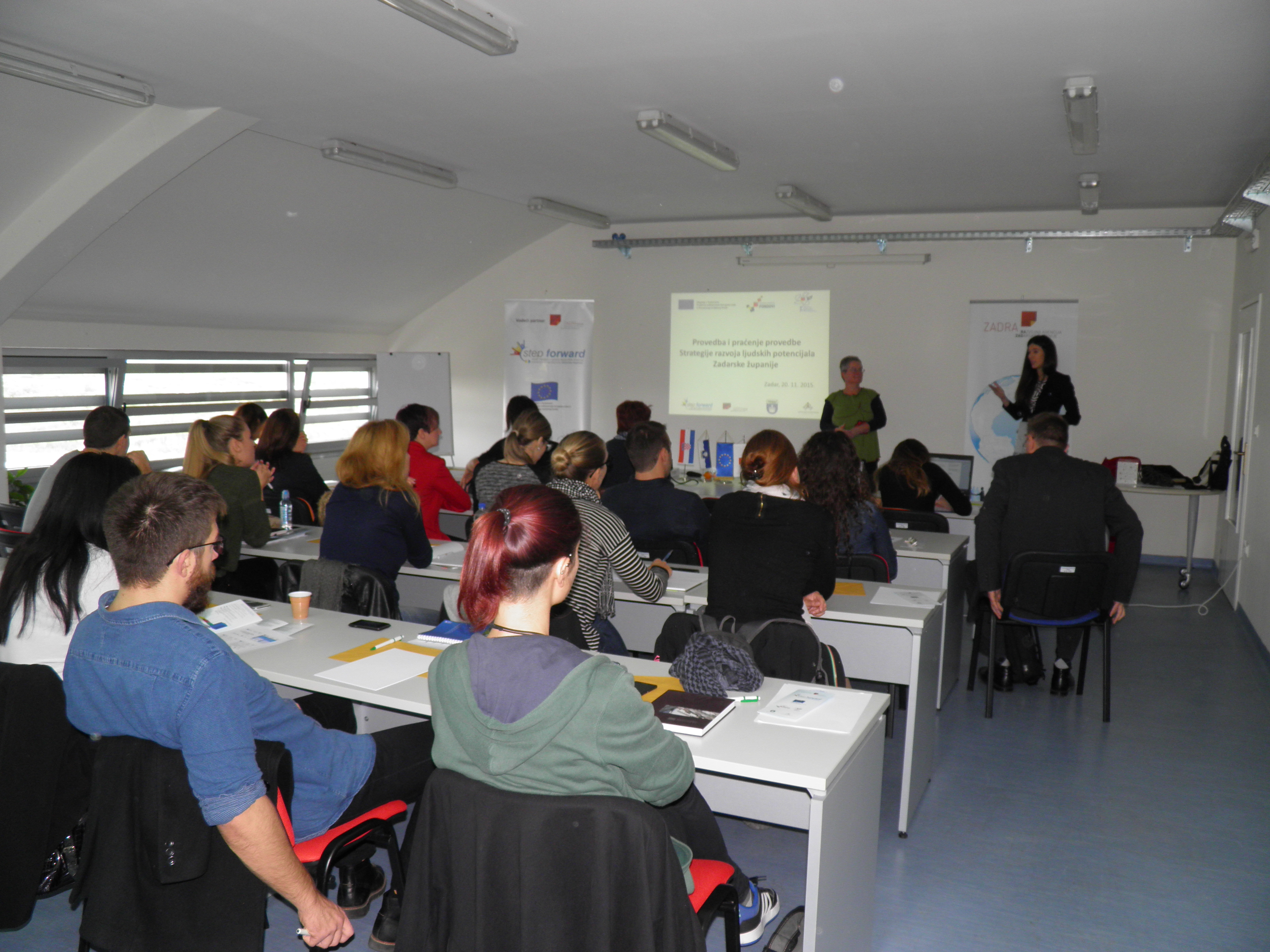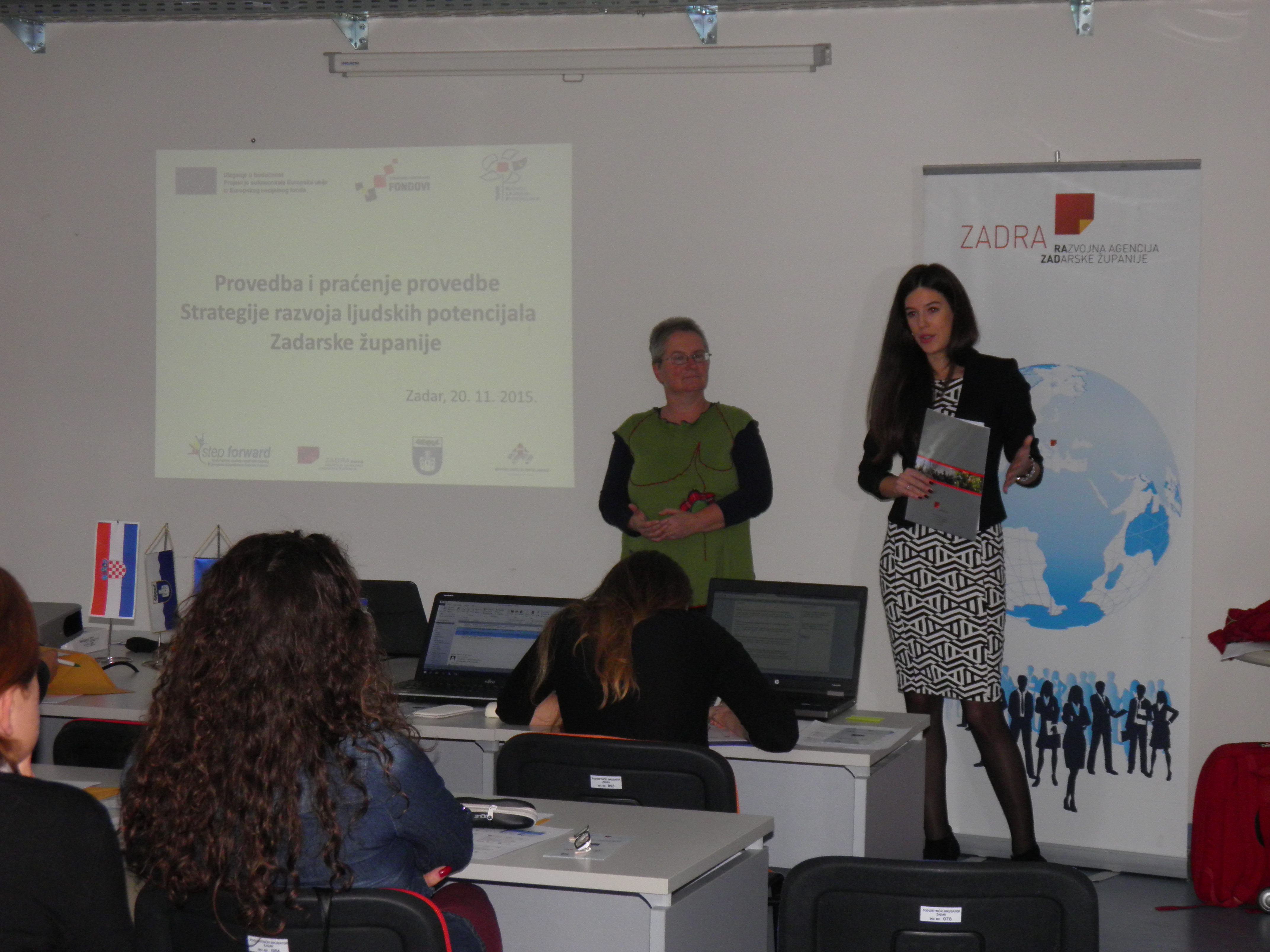U sklopu provedbe projekta “STEP FORWARD – Korak naprijed u jačanju kapaciteta Lokalnog partnerstva za zapošljavanje Zadarske županije” 20. studenog 2015. godine u Agenciji za razvoj Zadarske županije ZADRI NOVOJ održana je edukativna radionica pod nazivom „Provedba i praćenje provedbe Strategije razvoja ljudskih potencijala Zadarske županije“. Ova radionica je prva u nizu od ukupno dvije edukativne radionice koje će biti organizirane u sklopu provedbe projekta.
