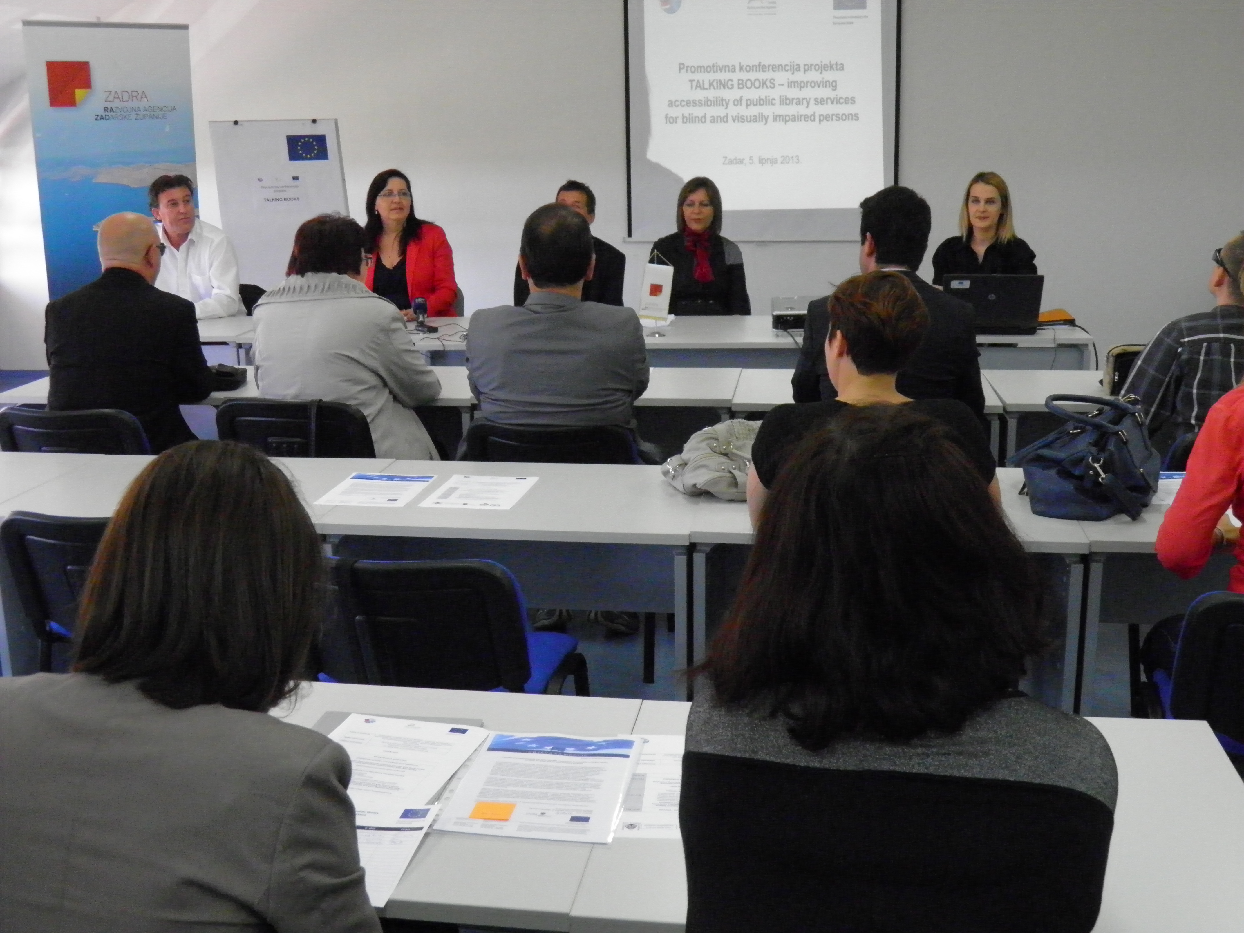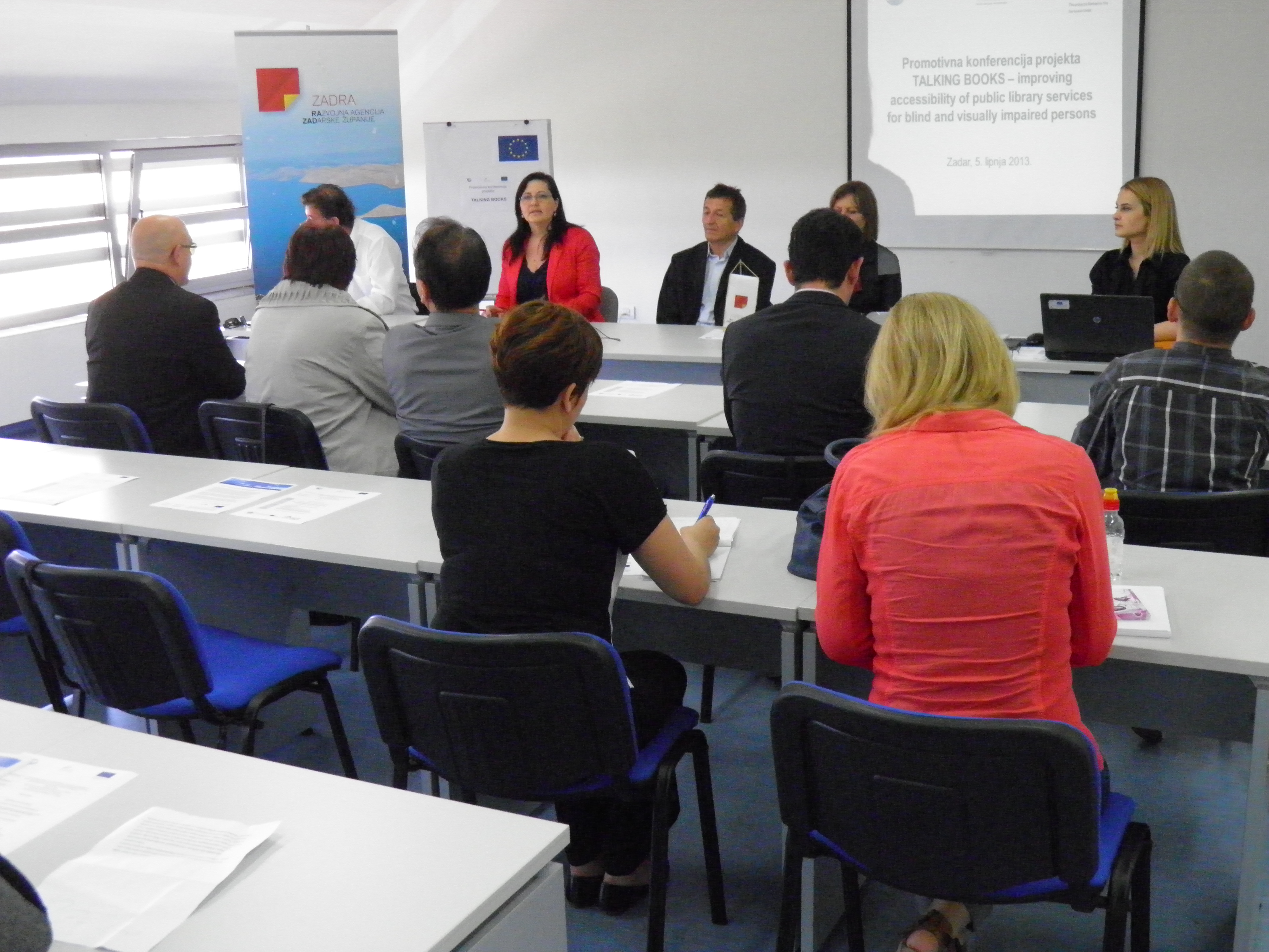 Danas je u prostorijama Razvojne agencije Zadarske županije ZADRA-e održana promotivna konferencija projekta TALKING BOOKS – improving accessibility of public library services for blind and visually impaired persons, sufinanciranog iz IPA II instrumenta pretpristupne pomoći EU, u sklopu Programa prekogranične suradnje Hrvatska- Bosna i Hercegovina 2007-2013. Na konferenciji je prisustvovalo ukupno 27 sudionika- predstavnika partnerskih institucija i medija.