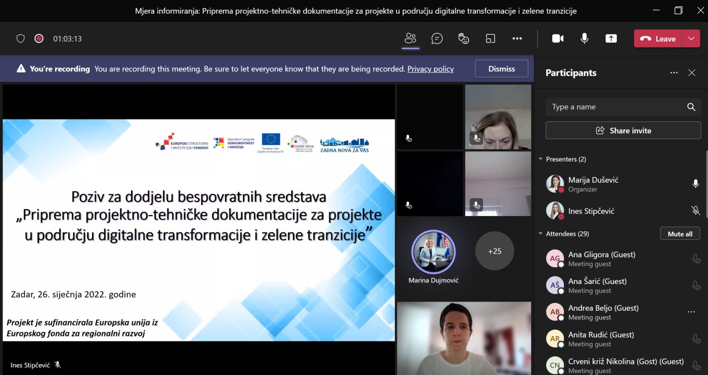 U organizaciji Agencije za razvoj Zadarske županije ZADRA NOVA u srijedu, 26. siječnja 2022. godine prezentirane su mogućnosti financiranja u okviru Poziva ''Priprema projektno-tehničke dokumentacije za projekte u području digitalne transformacije i zelene tranzicije''. Cilj ovog Poziva za dodjelu bespovratnih sredstava je pripremiti zalihu zrelih projekata u području digitalne transformacije i zelene tranzicije. Ovim Pozivom prihvatljivim prijaviteljima stavljaju se na raspolaganje bespovratna sredstva koja potječu iz Mehanizma za oporavak i otpornost, a kojima mogu financirati izradu projektno-tehničke dokumentacije svojih projekata u području digitalne transformacije i zelene tranzicije.