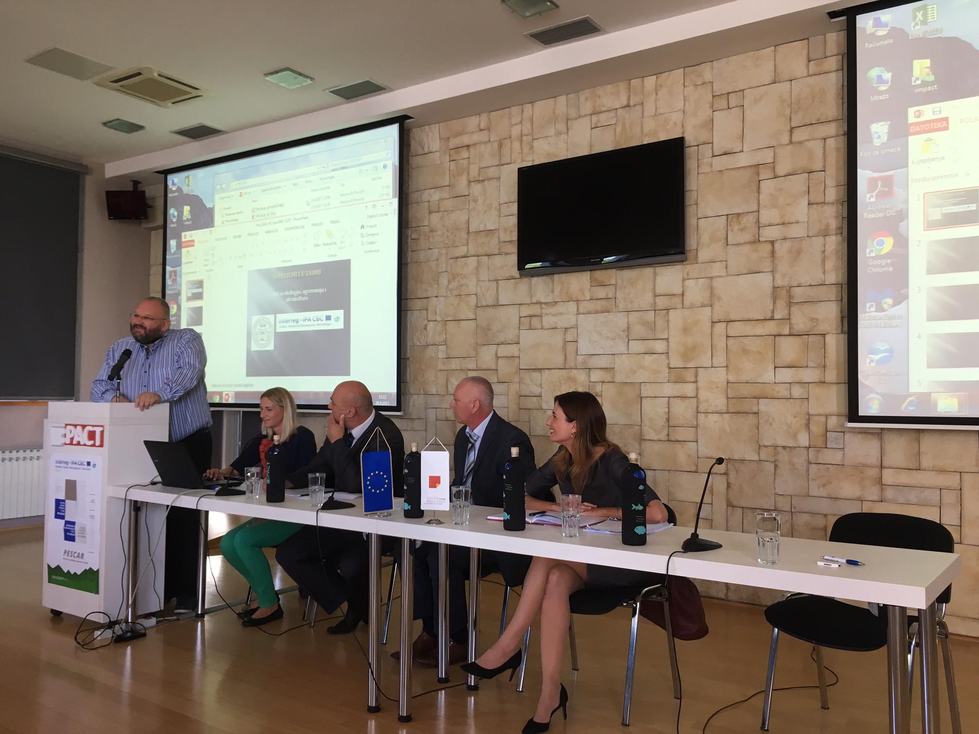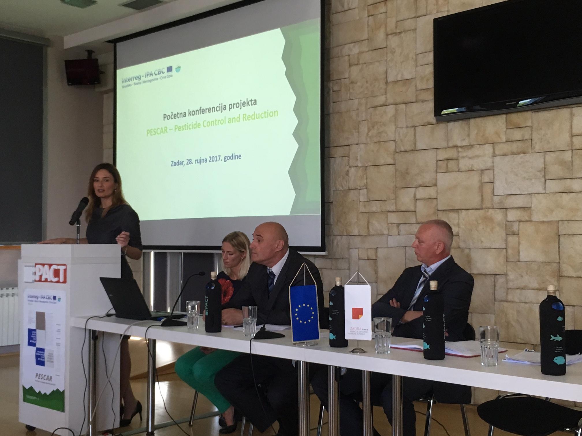 Početna konferencija projekta održana je u četvrtak, 28. rujna 2017. godine u IMPACT – Europskom centru za međusektorsku suradnju u Zadru. Pozdravnim riječima i kratkim uvodom konferenciju je otvorila Elma Filipović Majica, pomoćnica voditelja projekta Zvonimira Dorkina iz Zadarske županije. Nakon uvodnog obraćanja sudionicima se obratila gđa. Marica Babić, zamjenica ravnateljice, iz Agencije za razvoj Zadarske županije ZADRE NOVE, koja je predstavila djelokrug rada Agencije, kratku povijest nastanka projektne ideje te ulogu koju će Agencija, kao jedan od 5 partnera, obnašati u provedbi. Nakon gđe. Babić svoje su institucije predstavili i ostali projektni partneri, g. Perica Bulić iz Ministarstva poljoprivrede, šumarstva i vodoprivrede Hercegovačko – neretvanskog kantona, g. Tomislav Kos iz Odjela za ekologiju, agronomiju i akvakulturu Sveučilišta u Zadru i g. Luka Vranješ, ravnatelj Zavoda za poljoprivredu Zapadnohercegovačke županije.