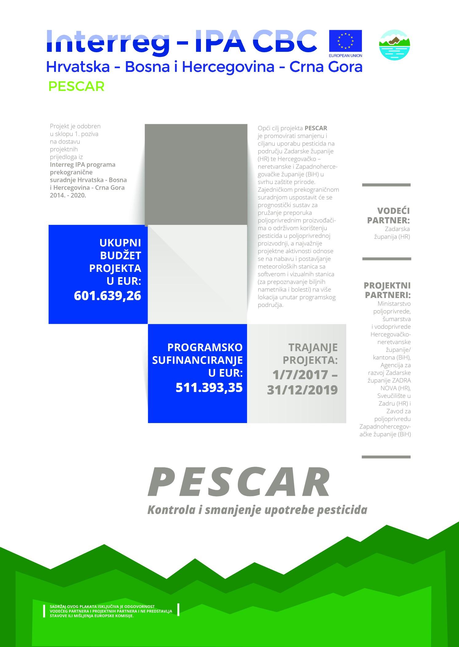 Od ukupno 164 projektna prijedloga koliko ih je bilo prijavljeno u 1. pozivu na dostavu projektnih prijedloga iz Interreg IPA programa prekogranične suradnje Hrvatska – Bosna i Hercegovina – Crna Gora 2014.-2020., projekt „PESCAR – Pesticide Control and Reduction“ jedan je od svega 21 koji su odobreni za financiranje.