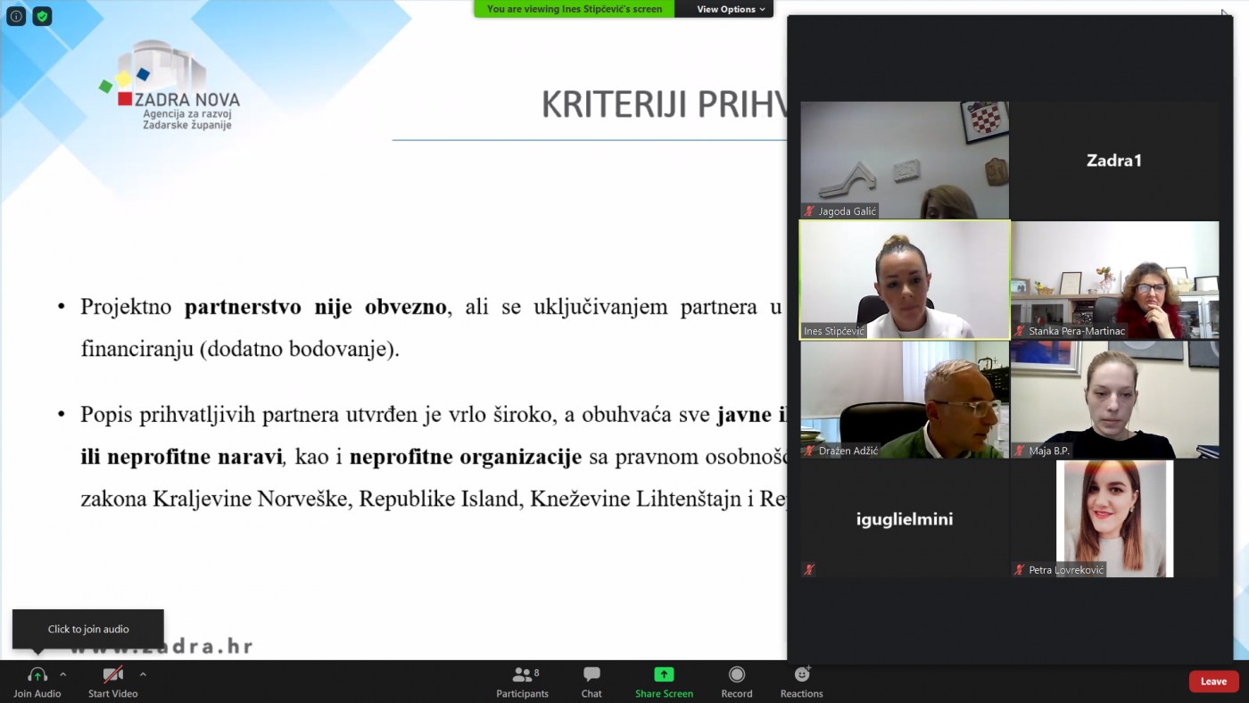U organizaciji Agencije za razvoj Zadarske županije ZADRA NOVA, u petak 29. siječnja 2021. godine, prihvatljivim prijaviteljima prezentirani su nacrti ključnih elemenata dvaju poziva na dostavu projektnih prijedloga.
