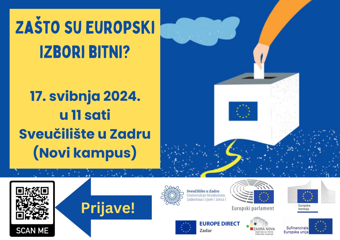 Agencija za razvoj Zadarske županije ZADRA NOVA u sklopu aktivnosti centra EUROPE DIRECT Zadar organizira informativno događanje Zašto su Europski izbori bitni? u petak, 17. svibnja 2024. godine na Sveučilištu u Zadru (Multimedijalna dvorana, Novi kampus, dr. Franje Tuđmana 24i) s početkom u 11 sati. Planirano trajanje događanja je do 12:30 sati.