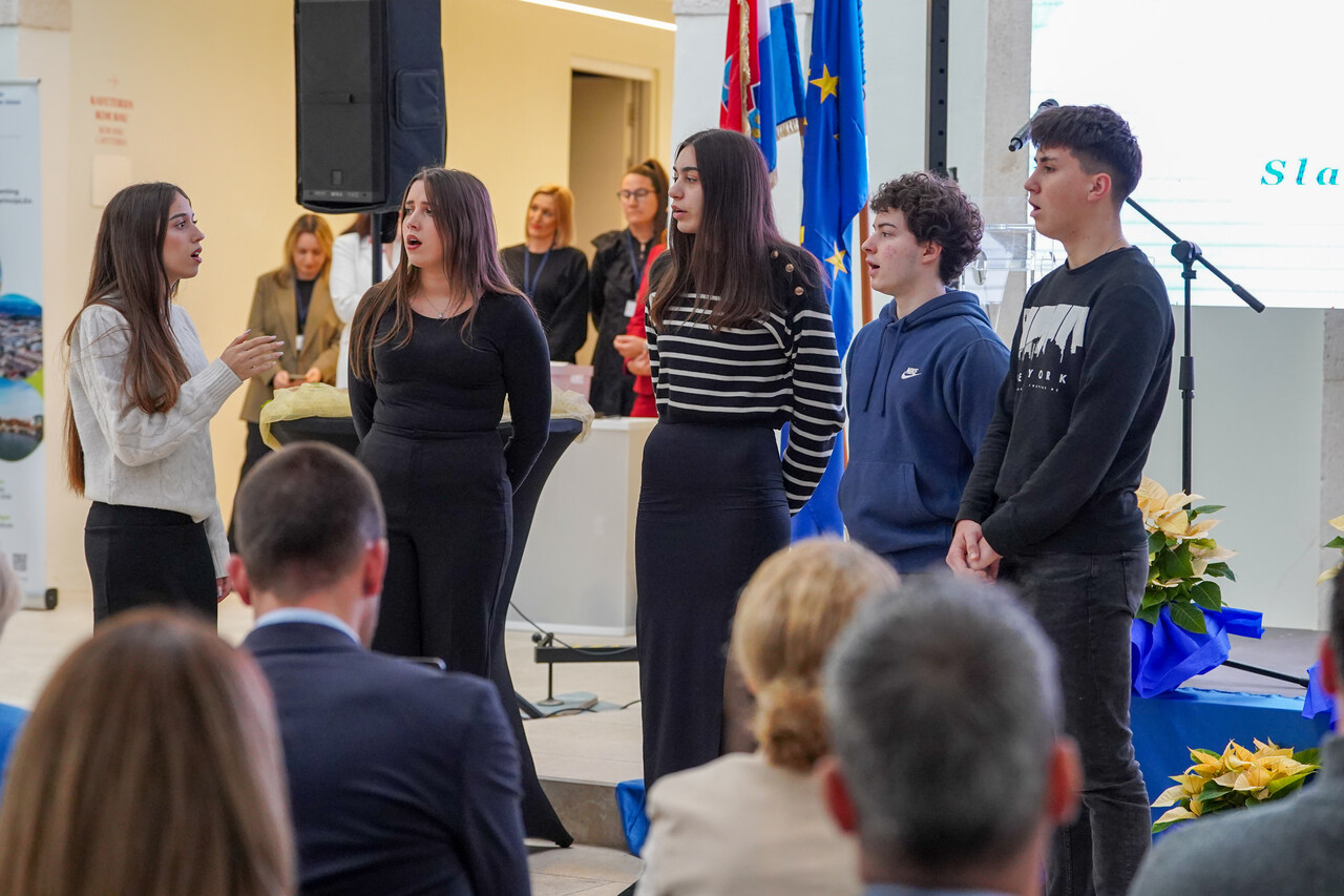 Svojim glazbenim nastupom program su obogatili učenici Gimnazije Vladimira Nazora, škole ambasadora Europskog parlamenta, okupljeni u klapu Feral pod vodstvom Ive Mustać Klarić.